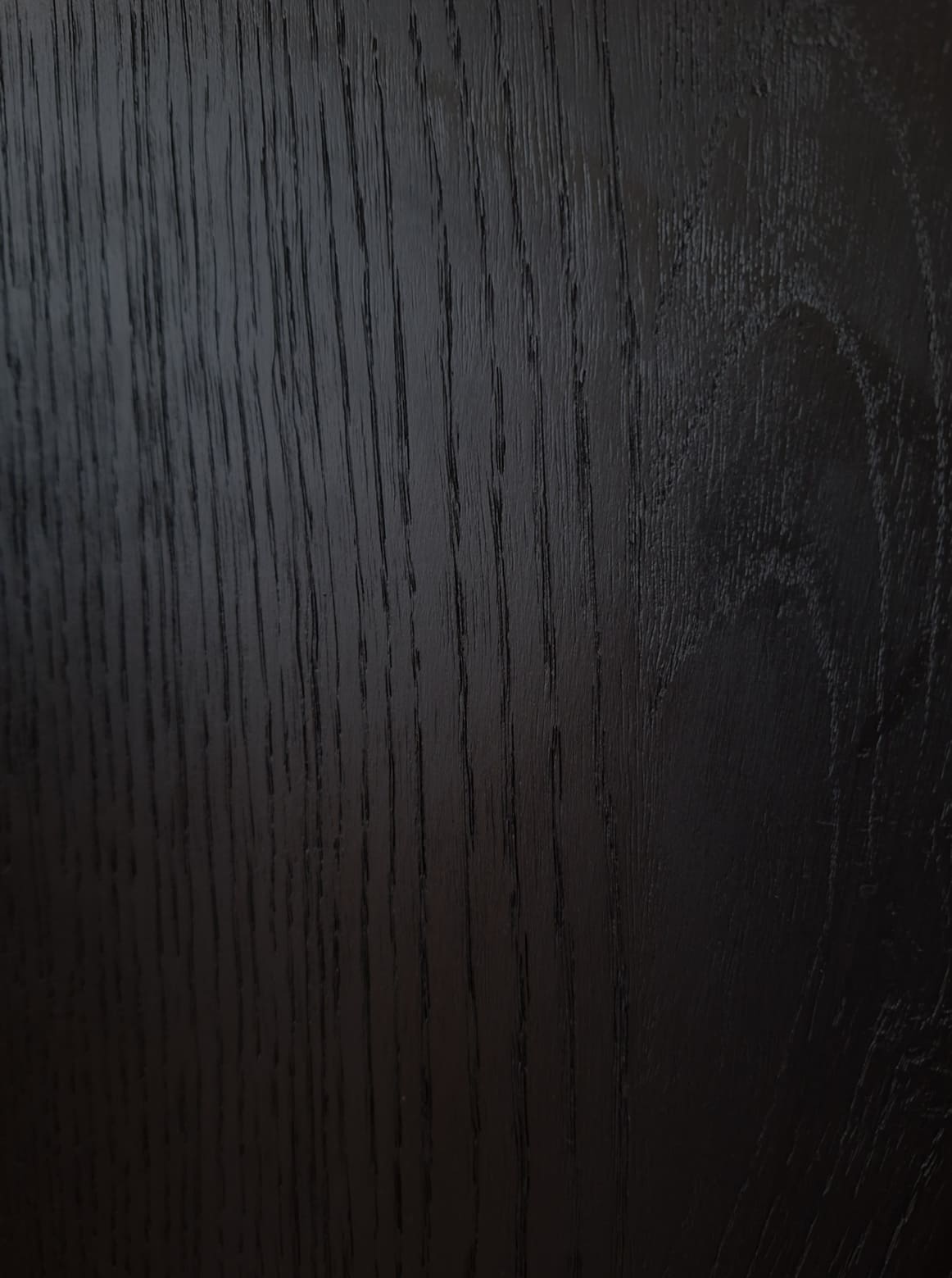 - Colore: La finitura pigmentata black applicata al rovere dona al legno una tonalità scura e intensa, ottenuta grazie all’uso di smalto nero. Questo smalto si deposita sulle superfici del legno, ma solo all’interno delle venature, esaltando il contrasto tra la profondità del nero e la bellezza naturale del rovere. Il risultato è un effetto elegante e contemporaneo, che mantiene visibili le sfumature originali del legno.